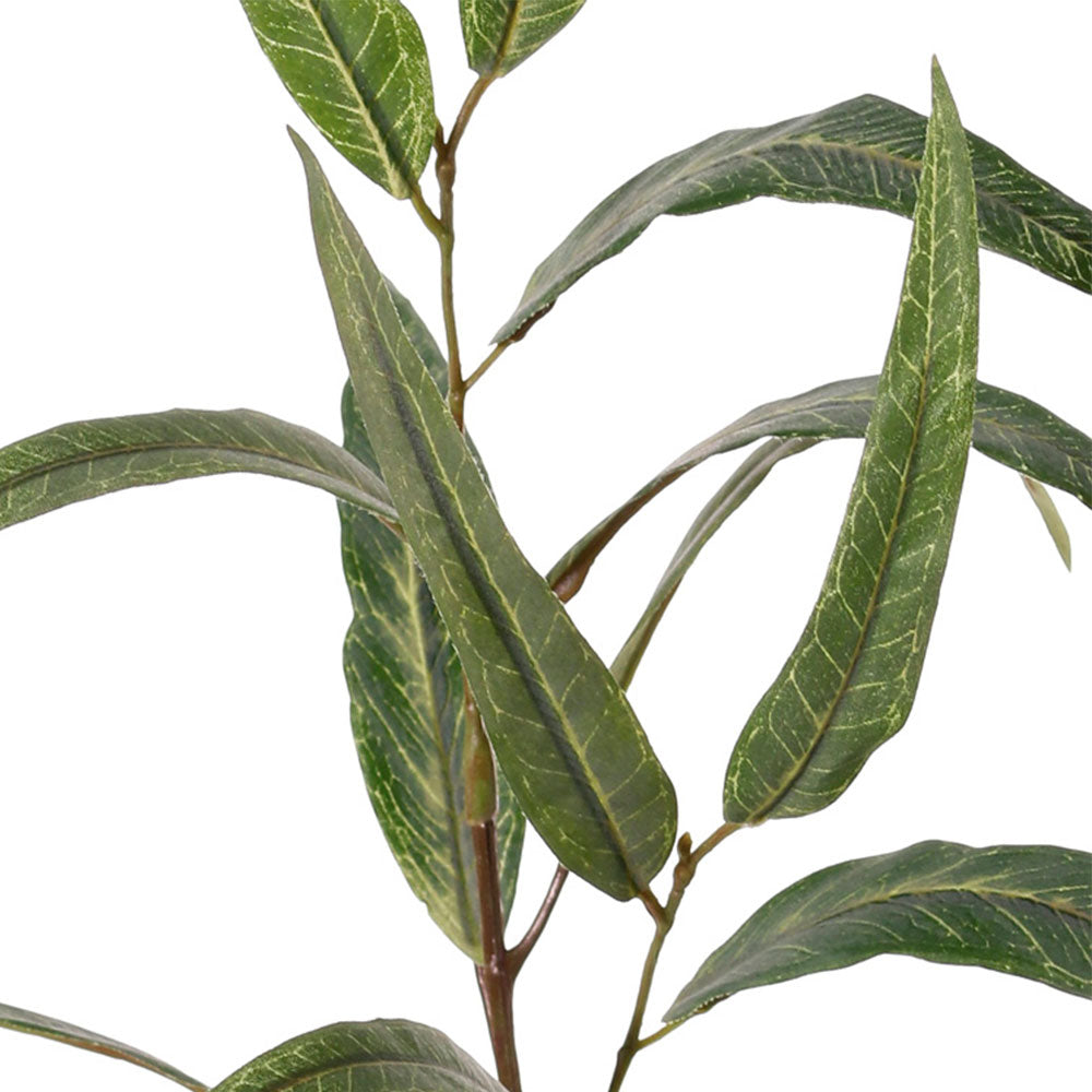 Rama artificial con tallo de alambre recubierto en plástico y hojas de tela con recubrimiento impermeable.