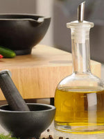 La alcuza de vidrio de cuello largo es perfecto para almacenar y servir aceite, vinagre o limón. Está hecha a mano y se produce con vidrio de alta calidad para una mayor durabilidad y una claridad excepcional. El vertedor de acero inoxidable tiene una función que ayuda a evitar gotear aceite o vinagre en la mesa y cuenta con un tapón de silicona fácil de quitar y limpiar.