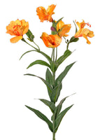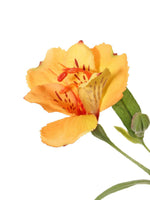 Flor artificial con pétalos hechos de seda, tallo de alambre recubierto en plástico y hojas de tela con recubrimiento impermeable.