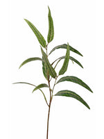 Rama artificial con tallo de alambre recubierto en plástico y hojas de tela con recubrimiento impermeable.