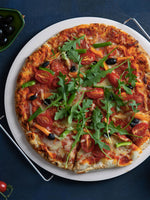 Producida a partir de cerámica duradera, la piedra distribuye el calor de manera rápida y uniforme, lo que brinda a la base de pizza auténtica y crujiente perfecta. La rejilla de servicio cromada protege las mesas cuando se sirve directamente del horno a la mesa. Las piedras cerámicas también son aptas para horno y microondas.