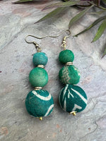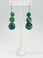 Las cuentas de madera son retales de fábricas de muebles cercanas, y la tela que las recubre proviene de saris viejos y desgastados, recolectados por toda la India. No hay dos cuentas iguales.
