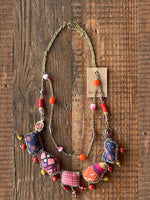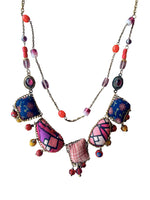 Collar de cadena dorada con mostacillas y dijes de tela reciclada. Un complemento que no puede faltar!