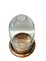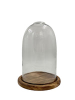 Fanal redondo con base de madera. Cuenta con un orificio en la parte superior ideal para usarlo con velones encendidos.