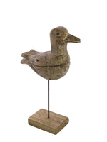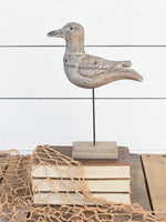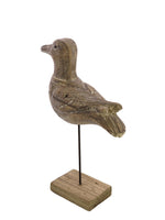 Figura tallada a mano en madera de demolición con un acabado rustico.
