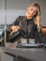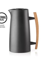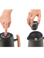 El Termo tiene un diseño moderno con un mango de madera elegante y mantiene las bebidas calientes durante 12 horas o frías durante 24 horas. Se hace click para abrir y cerrar fácilmente y es a prueba de fugas. Es fácil de llenar gracias a la boca ancha del jarro y tiene una excelente estabilidad.