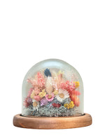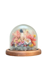 Mini mundo con flores secas y pájaro de polietileno y plumas.