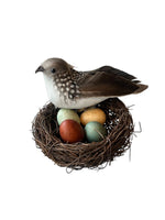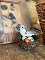 Nido de rattan tejido a mano, con huevitos y pájaro de polietileno.