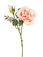 Flor artificial con pétalos hechos de seda, tallo de alambre recubierto en plástico y hojas de tela con recubrimiento impermeable.
