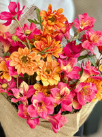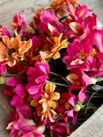 El ramo esta armado con astromelias fucsias y crisantemos naranjos.