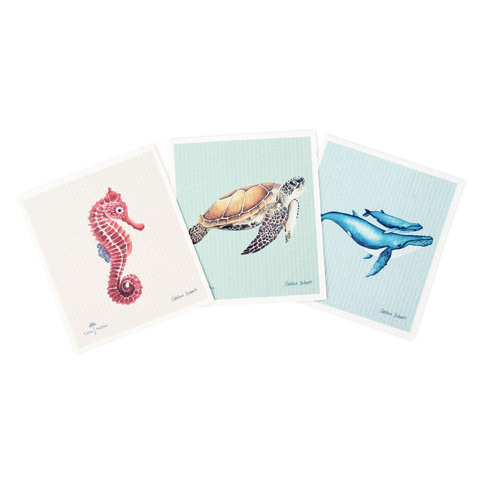 Colección de 3 Paños Esponjas 100% compostables en el hogar. Son my eficientes! Pueden absorver hasta 20 veces su peso y, gracias a la celulosa, es de secado rápido. Se lava en lavadora y sale como nuevo! Es durable para que te acompañe más tiempo. Los colores y diseños se mantienen intensos.