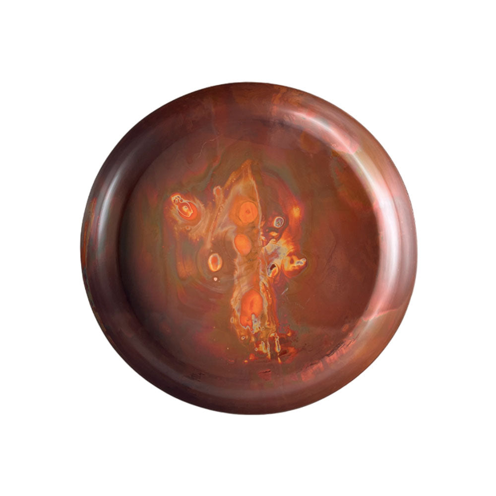 Bandeja redonda de metal color cobrizo gastado. Combinalo con velas y accesorios para crear un centro de mesa único.