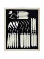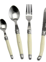 Los cubiertos Laguiole by Andre Verdier son ya un clásico reconocido por su elegante y práctico diseño. Cada pieza representa el pináculo de la mano de obra que distingue a los cubiertos Laguiole de todos los demás. Cada pieza está elaborada con maestría en acero inoxidable , con refuerzos de acero inoxidable, mangos de cinco remaches en resina de alta resistencia color hueso y la tradicional abeja Laguiole. La construcción de espiga completa garantiza un equilibrio de experto y una durabilidad superior. El acero inoxidable es de alta calidad con un fantástico acabado de espejo. Son aptos para lavavajillas , pero se recomienda lavar a mano para prolongar la vida útil de los cubiertos.