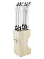 Elaborados con maestría en acero inoxidable, con refuerzos de acero inoxidable, mangos de cinco remaches en resina de alta resistencia color blanco y la tradicional abeja Laguiole. La construcción de espiga completa garantiza un equilibrio de experto y una durabilidad superior. El...
