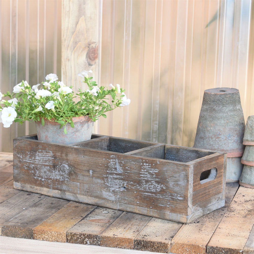Caja de madera con divisiones. Tiene múltiples usos, para poner velas, plantas, botellas y mucho más!, es u objeto decorativo en si. Es una pieza única con la nobleza y belleza de la madera gastada por el tiempo.