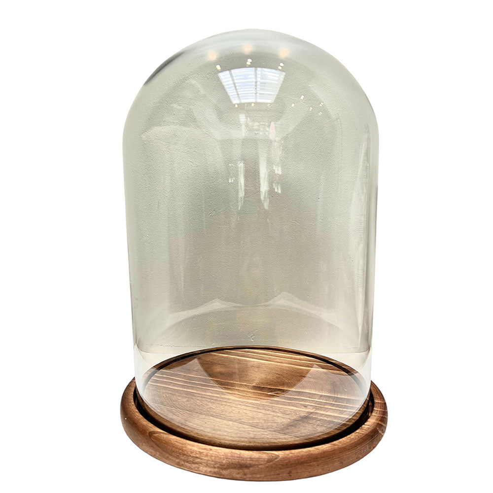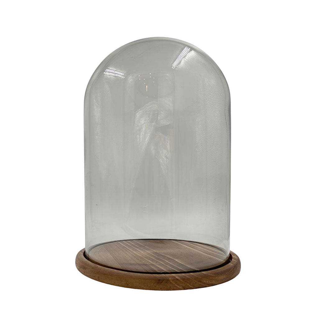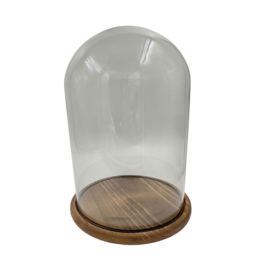 Fanal redondo con base de madera. Ideal para decorar una mesa lateral o repisa. Compleméntalo con nuestros accesorios de decoración.