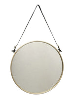 Espejo redondo de pared colgante de MDF y metal, con correa de hebilla y acabado de latón cepillado