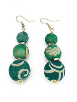 Las cuentas de madera son retales de fábricas de muebles cercanas, y la tela que las recubre proviene de saris viejos y desgastados, recolectados por toda la India. No hay dos cuentas iguales.
