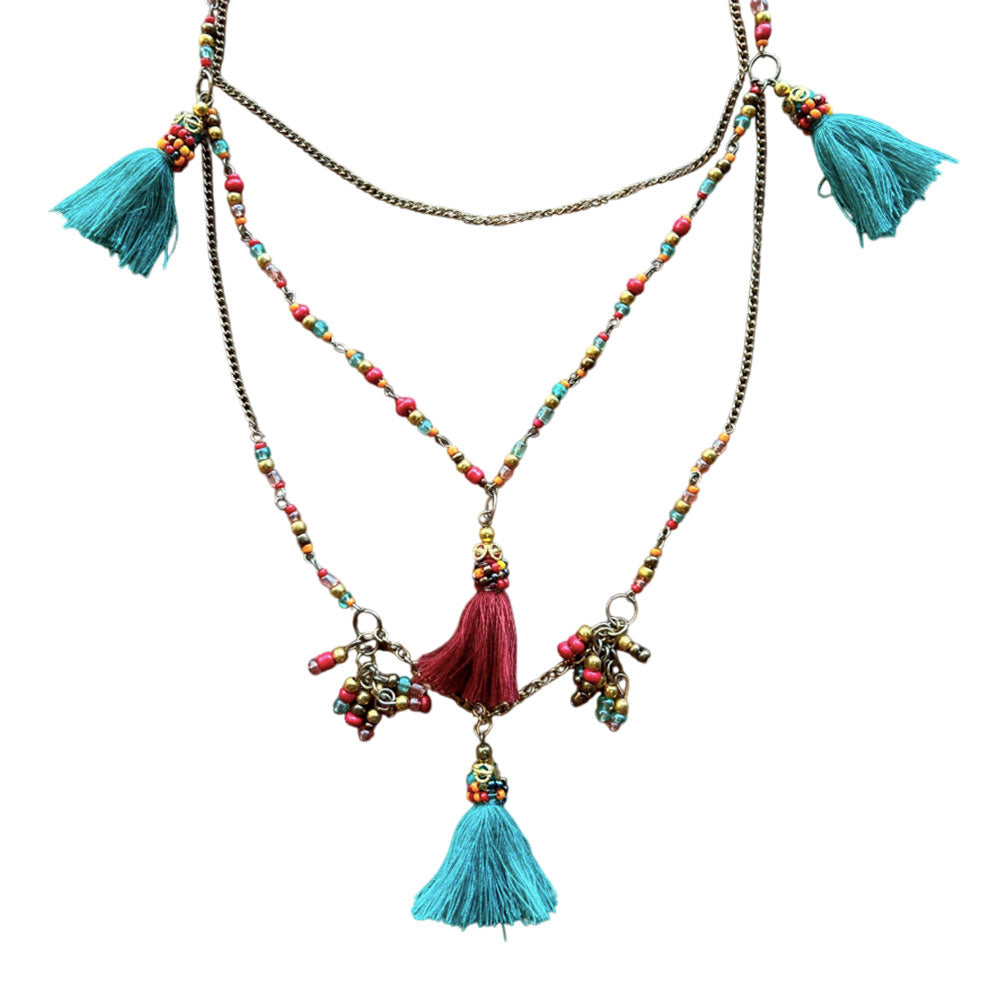 Collar de metal en colores dorado, rojo y celeste con borlas de hilo. Un complemento que no puede faltar!