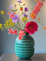 Agrega un toque de color a tu hogar con este florero de metal verde con rayas.