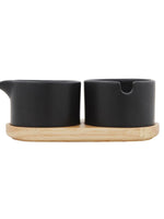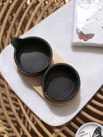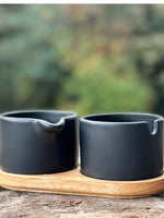 Dos cuencos negros de ceràmica en una base de madera. Uno de los cuencos tiene una boquilla para poder servir crema sin problemas y el otro cuenta con un sacado el cual lo hace ideal para el azucar y su cuchara.