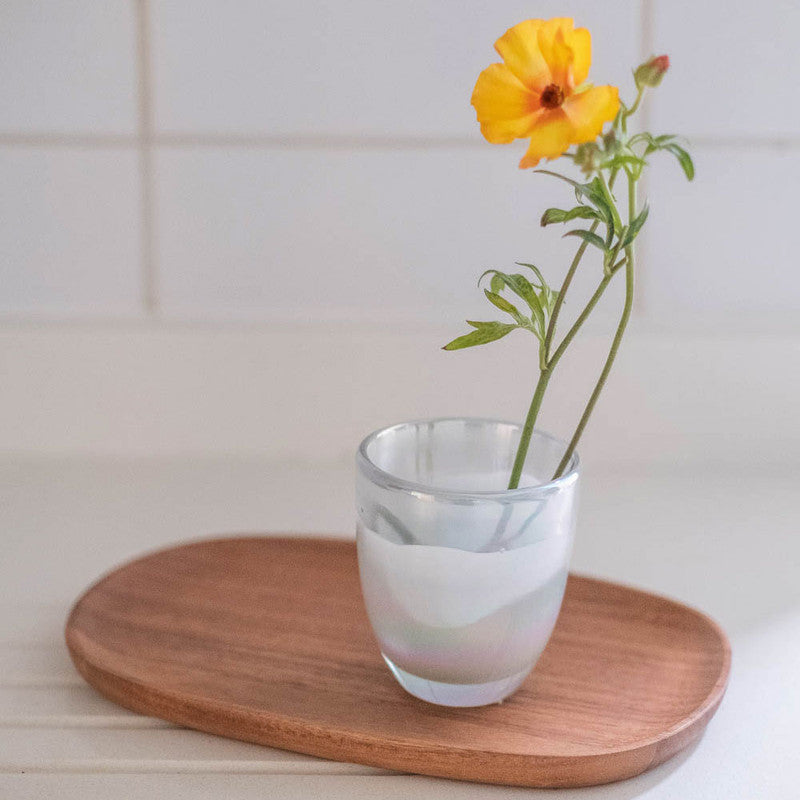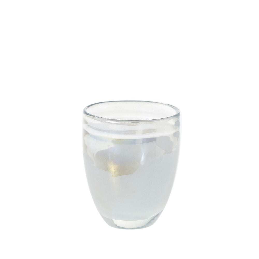 Florero de vidrio soplado con acabado en tono blanco perla.