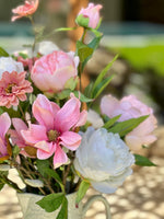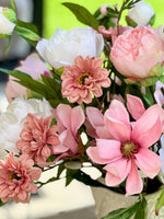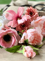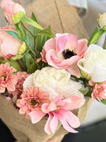 El ramo esta armado con peonias blancas, peonias palo de rosa, crisantemo rosado, anémona rosada y magnolia stellata rosada