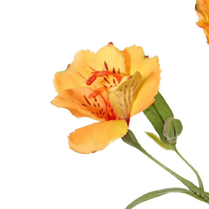 Flor artificial con pétalos hechos de seda, tallo de alambre recubierto en plástico y hojas de tela con recubrimiento impermeable.
