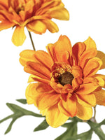 Flor artificial con pétalos hechos de seda, tallo de alambre recubierto en plástico y hojas de tela con recubrimiento impermeable.