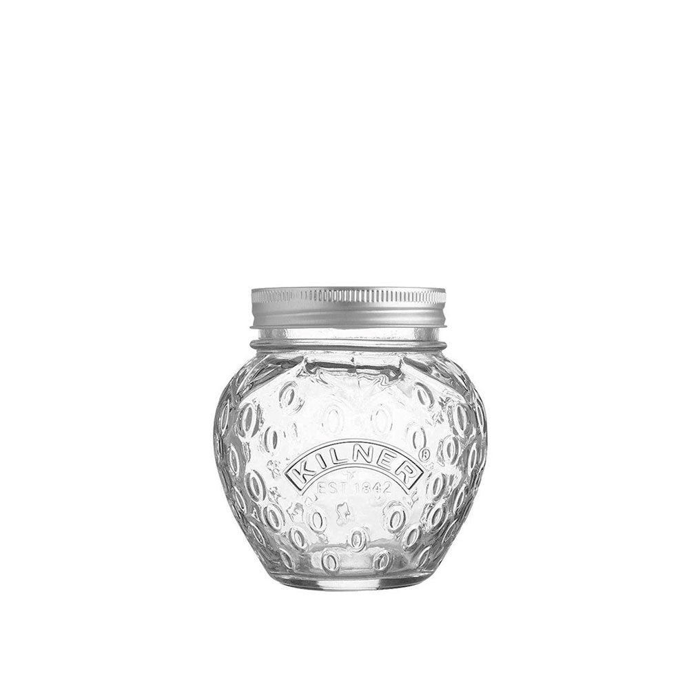 Precioso frasco de vidrio con forma de frutilla para conservar tus mermeladas favoritas. Incluye tapa metalica para cierre al vacio.