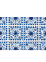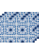 Un patrón de mosaicos en una mezcla de inspiración mediterránea de azul y blanco invita a que fluyan los buenos momentos para todos los reunidos en la mesa.