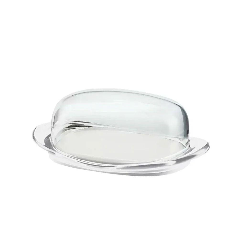 Una elegante mantequillera, compuesta por una práctica base y una bella campana transparente. Su tamaño adecuado y su práctico diseño la convierten en un objeto de uso funcional y fácil de guardar.