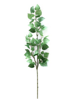 Rama artificial con tallo de alambre recubierto en plástico y hojas de tela con recubrimiento impermeable.