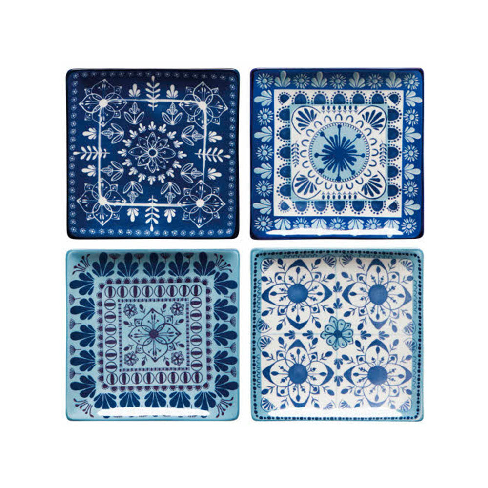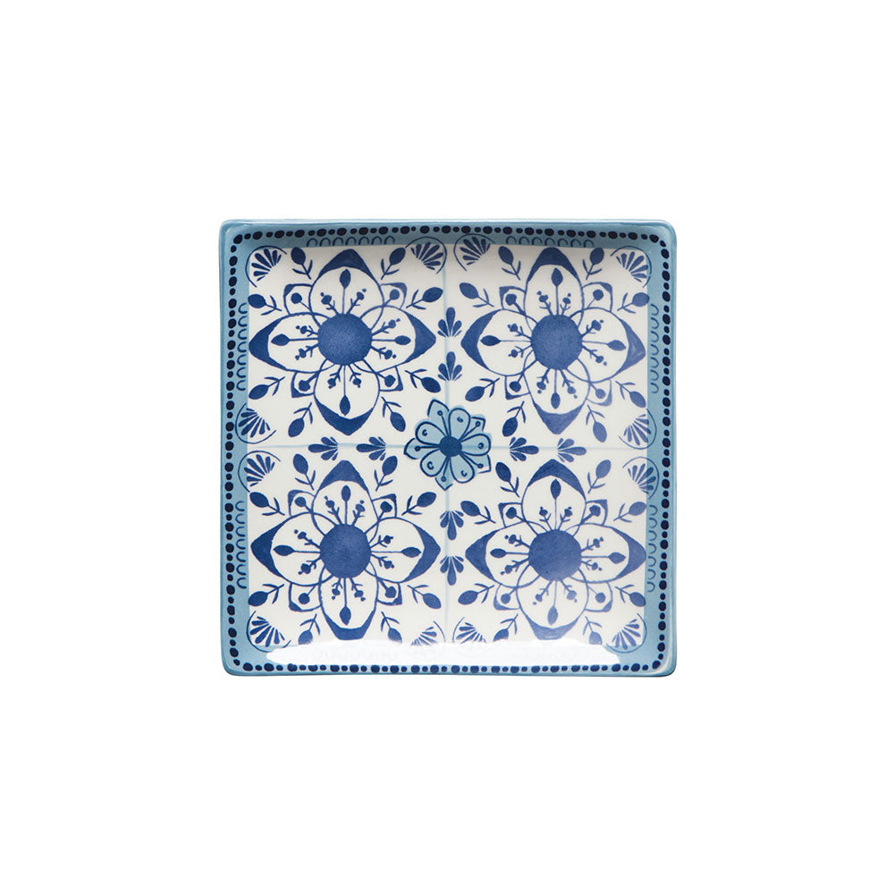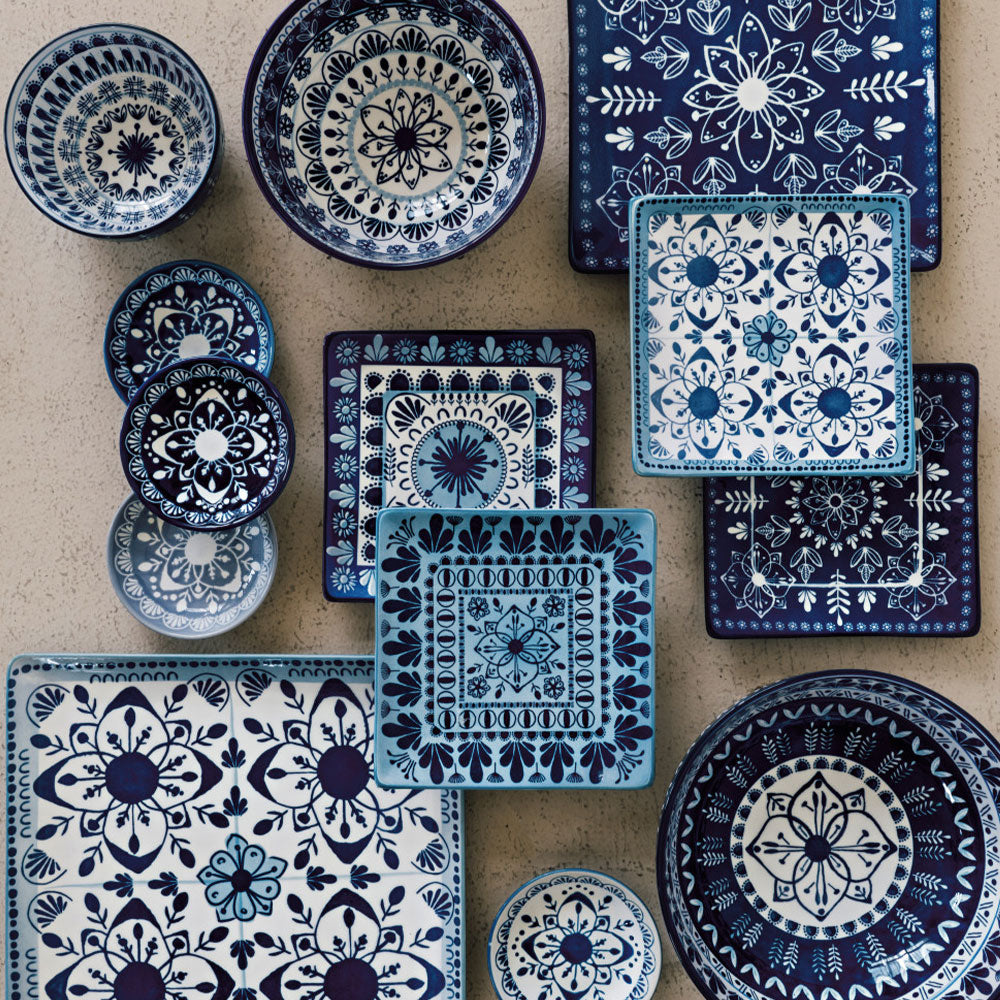 Un diseño de mosaicos en una mezcla de inspiración mediterránea de azul y blanco invita a que fluyan los buenos momentos para todos los que se reúnen a la mesa. Líneas onduladas de color saturado bailan sobre la superficie en pinceladas pictóricas, creando una expresión de abundante alegría.