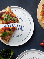 Ya sea que le gusten sus pizzas de Nápoles, Nueva York o Chicago, este plato es lo que necesitas para hornear o servir sus pizzas caseras desde el horno hasta la mesa. Están hechos de porcelana de calidad y cuentan con decoraciones con estilo caja de pizza.