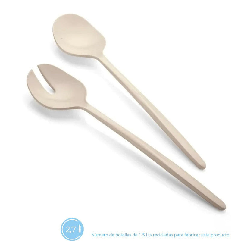 Set de dos cucharas para servir, son fabricadas íntegramente a partir del reciclaje de 2,7 botellas de agua PET (plástico) post consumo. Perfectas para tus postres, aperitivos y ensaladas!