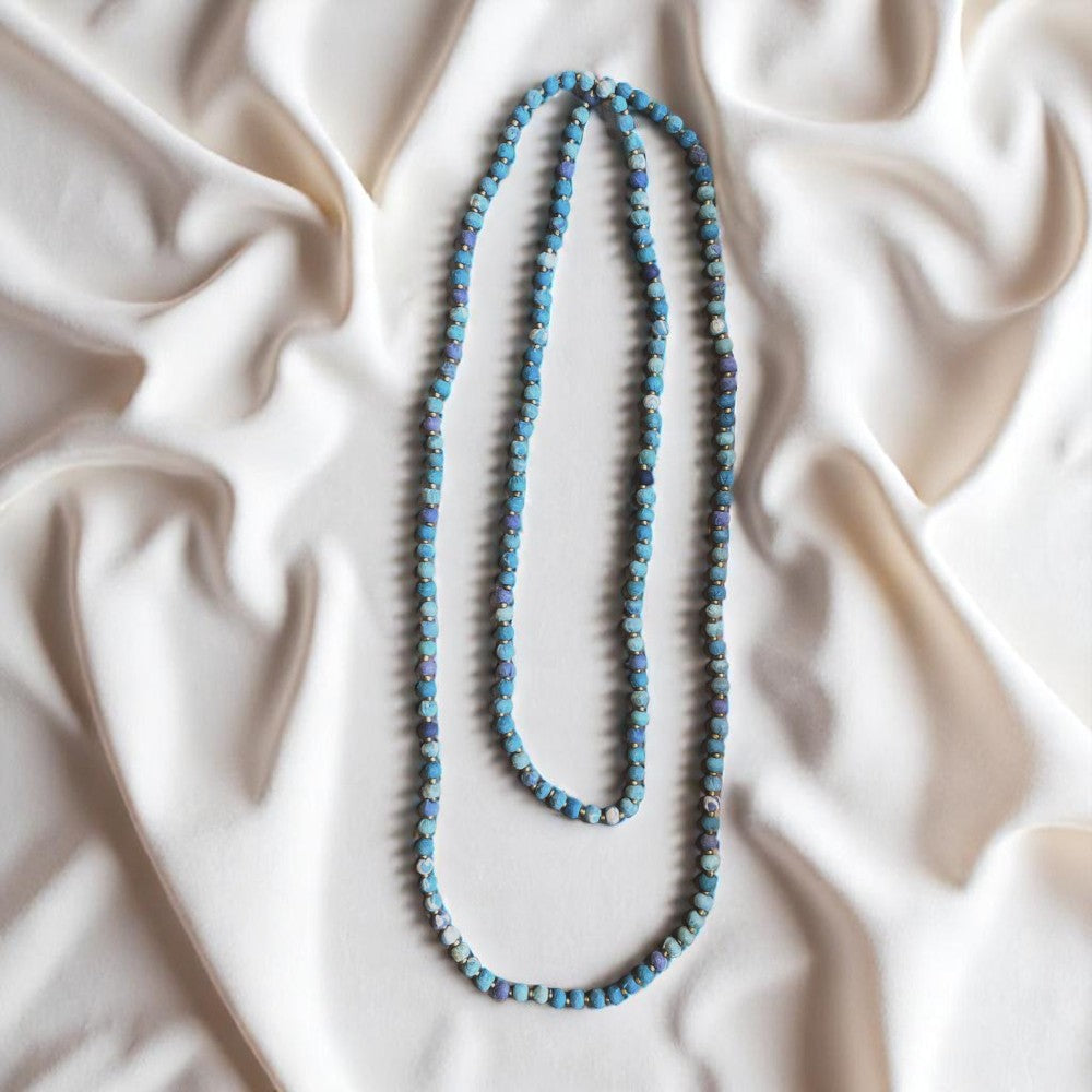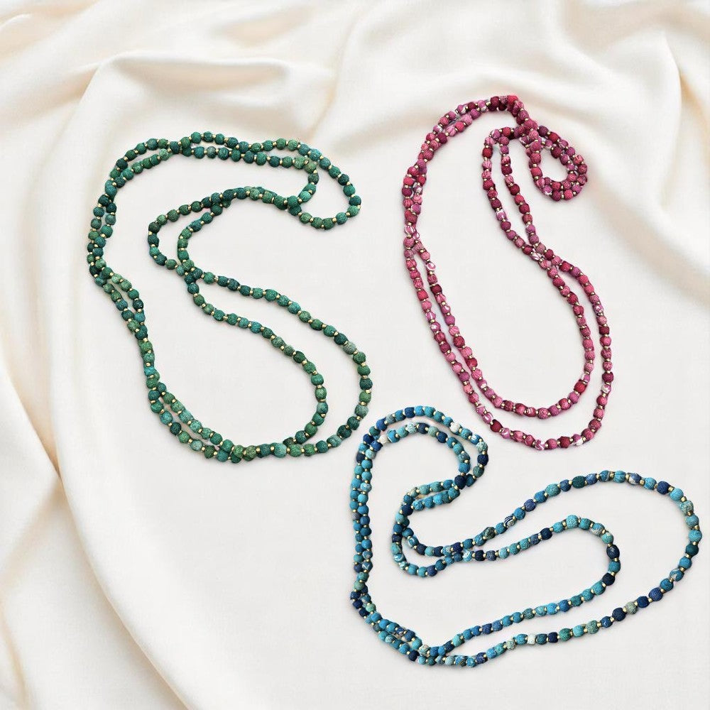 Las cuentas de madera son retales de fábricas de muebles cercanas, y la tela que las recubre proviene de saris viejos y desgastados, recolectados por toda la India. No hay dos cuentas iguales.