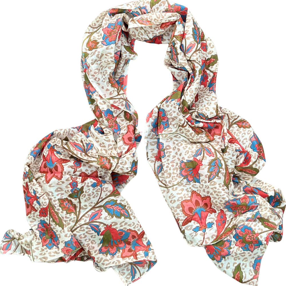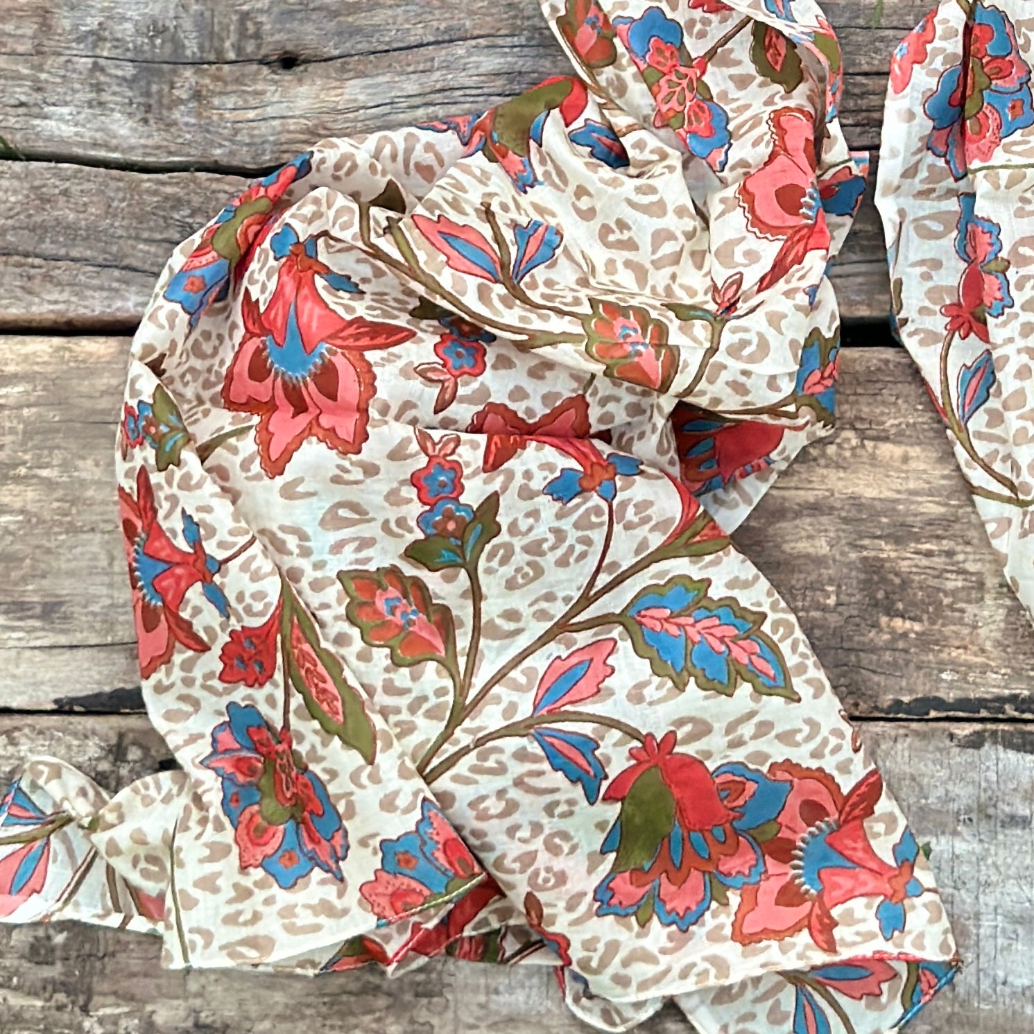Pañuelo 100% algodón hecho e impreso en India, con diseño de flores en tonos naranjos, crudo, toques de azul y verdes, un diseño sobrio en tonos neutros que será el complemento perfecto para tu look.