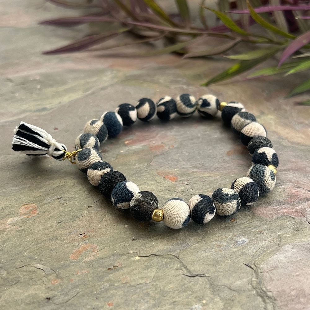 Las cuentas de madera son retales de fábricas de muebles cercanas, y la tela que las recubre proviene de saris viejos y desgastados, recolectados por toda la India. No hay dos cuentas iguales.
