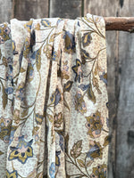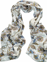 Pañuelo 100% algodón hecho e impreso en India, con diseño de flores en tonos azules, crudo, rosado pálido y verdes, un diseño sobrio en tonos neutros que será el complemento perfecto para tu look.
