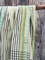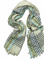Pañuelo 100% algodón hecho e impreso en India, con diseño de líneas en tonos verdes claro y crudo, un diseño sobrio en tonos neutros que será el complemento perfecto para tu look.