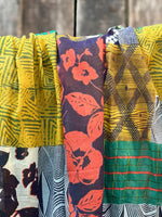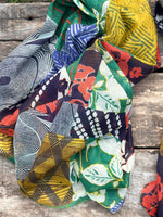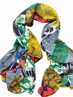 Pañuelo 100% algodón hecho e impreso en India, con diseño tipo patchwork en colores verde oscuro, rojo, amarillo y azul con detalles en negro, un diseño entretenido que será el complemento perfecto para tu look.