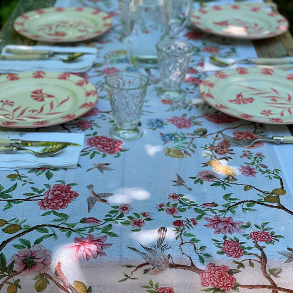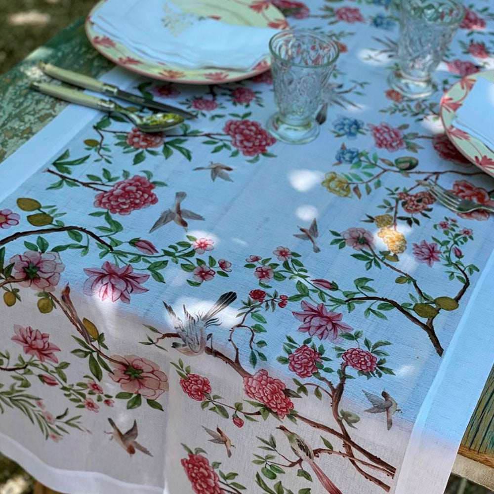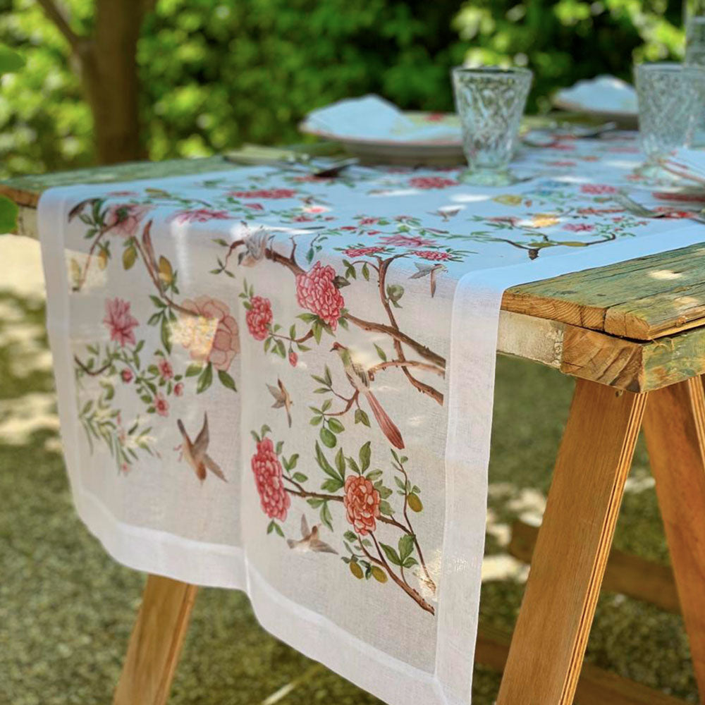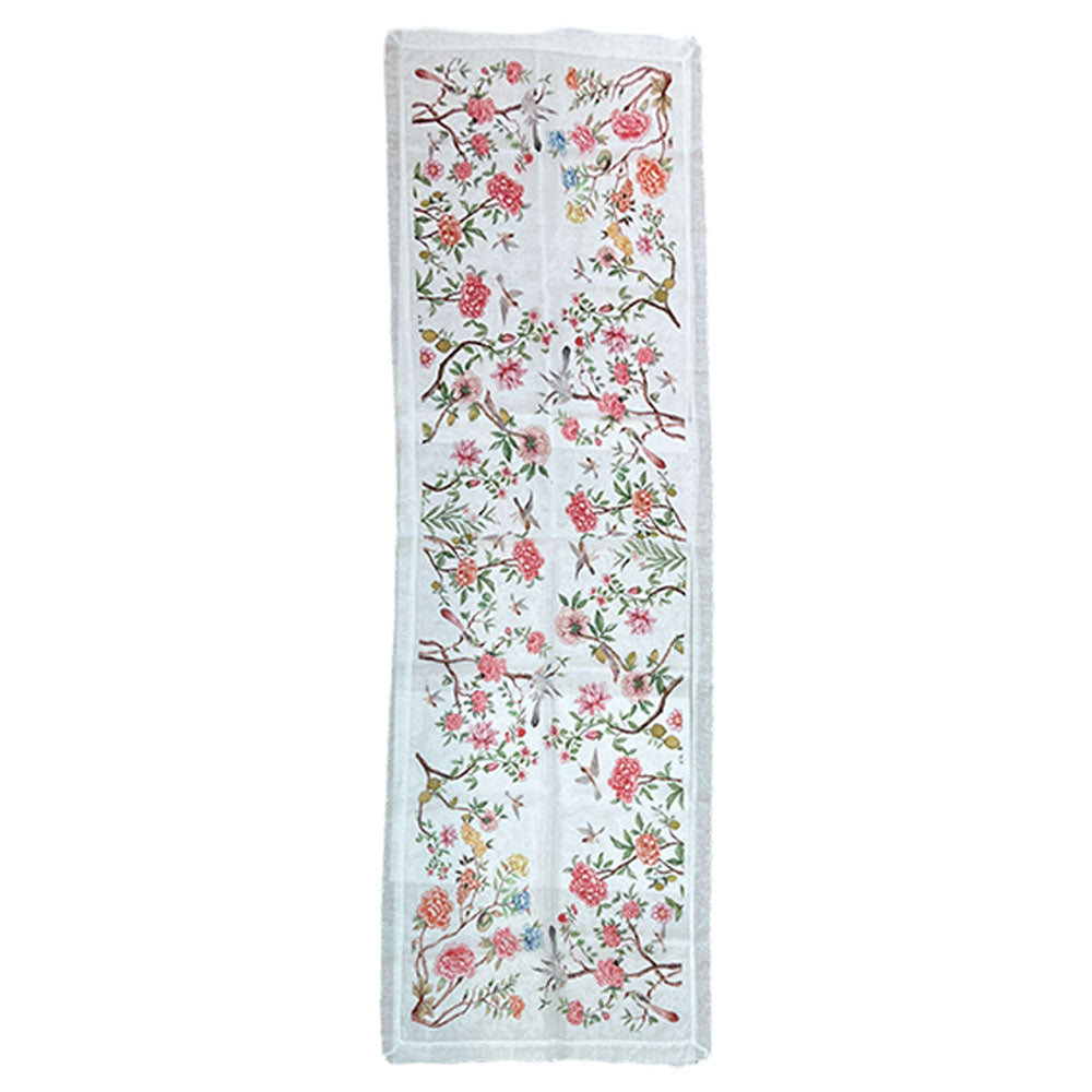 Camino de Mesa velo de organza transparente estampado con motivos de aves y hojas verdes, ideal para esta temporada de primavera/verano. Puedes usarlos de centro de mesa, o bien cruzados marcando los puestos enfrentados, con o sin mantel blanco de base. De cualquier forma te lucirás!