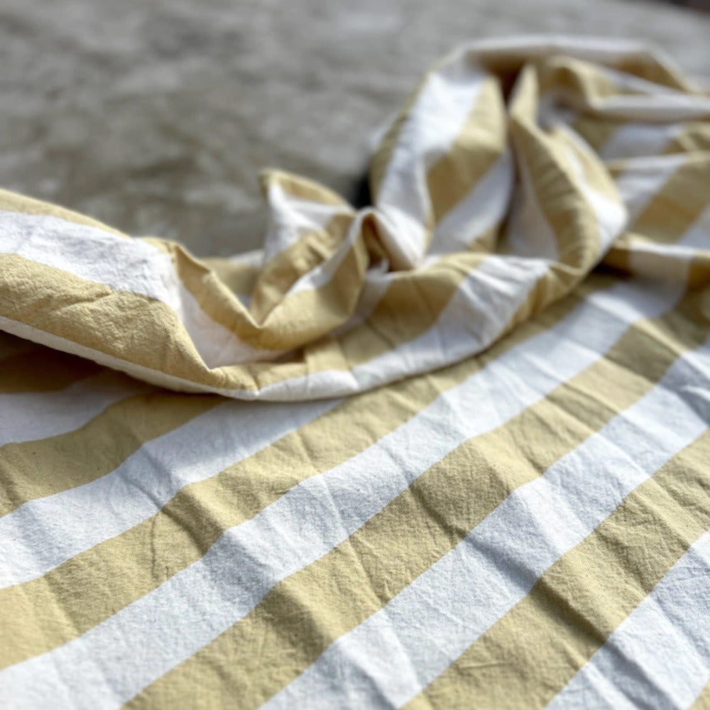 Mantel de tusor rayado, lavado y arrugado natural. Son elaborados de manera artesanal, con el valor del trabajo manual y lo desigual que hace a cada pieza única.