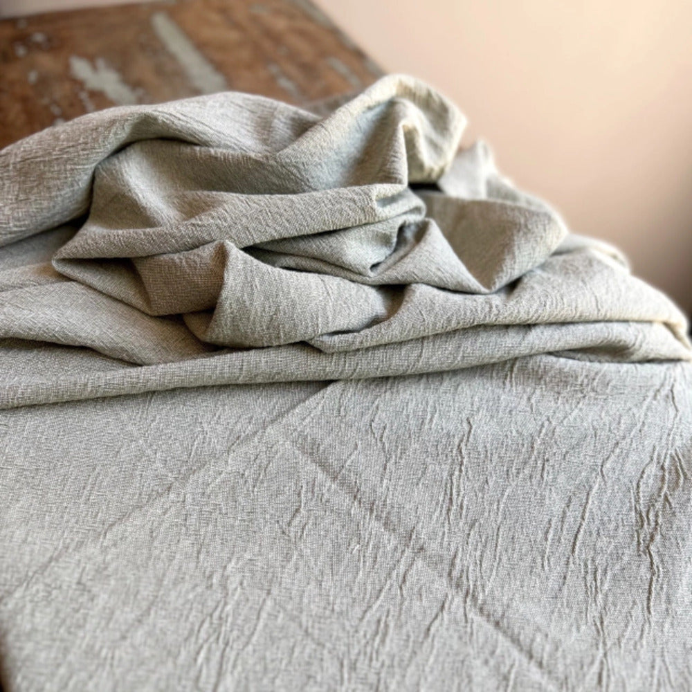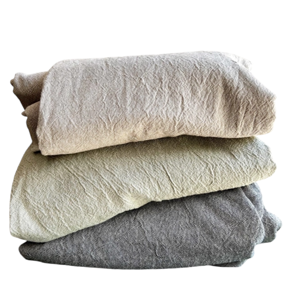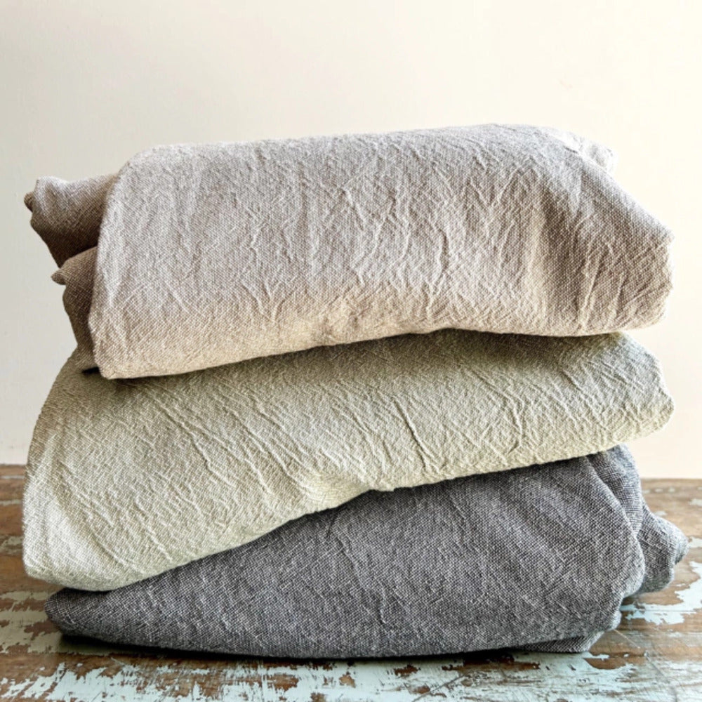 Mantel con textura y arrugado natural. Es de 100% algodón, noble y resistente al uso y al lavado. Son elaborados de manera artesanal, con el valor del trabajo manual y lo desigual que hace a cada pieza única.
