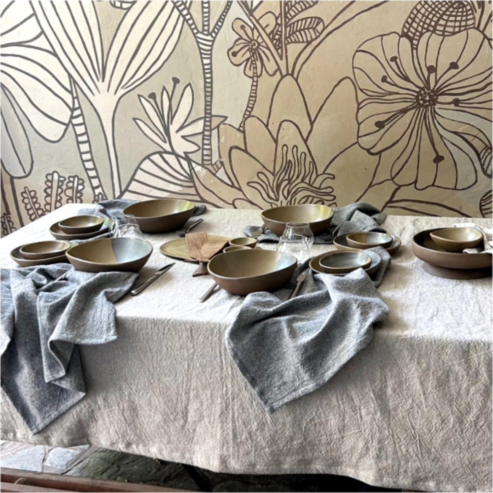 Mantel con textura y arrugado natural. Es de 100% algodón, noble y resistente al uso y al lavado. Son elaborados de manera artesanal, con el valor del trabajo manual y lo desigual que hace a cada pieza única.