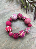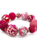Las cuentas de madera son retales de fábricas de muebles cercanas, y la tela que las recubre proviene de saris viejos y desgastados, recolectados por toda la India. No hay dos cuentas iguales.