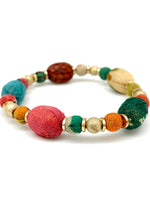 Las cuentas de madera son retales de fábricas de muebles cercanas, y la tela que las recubre proviene de saris viejos y desgastados, recolectados por toda la India. No hay dos cuentas iguales.