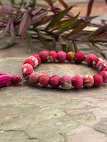 Las cuentas de madera son retales de fábricas de muebles cercanas, y la tela que las recubre proviene de saris viejos y desgastados, recolectados por toda la India. No hay dos cuentas iguales.