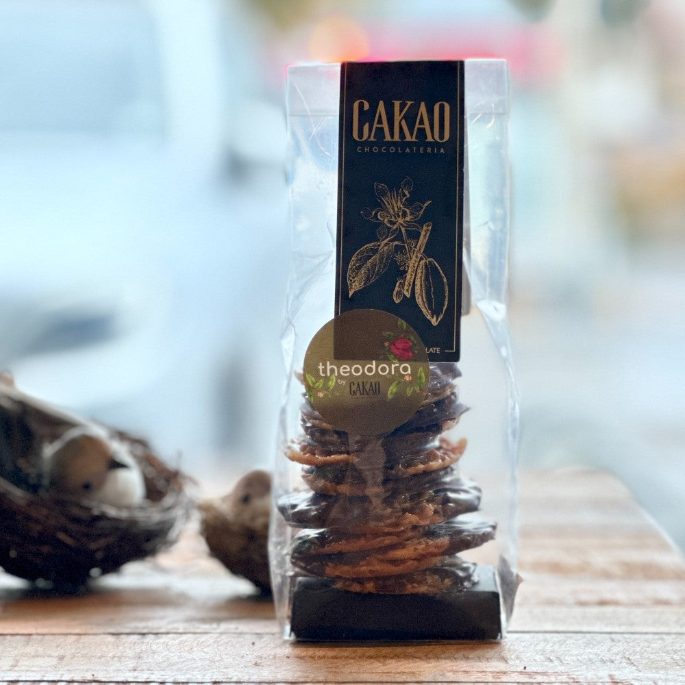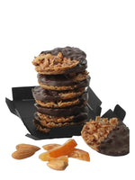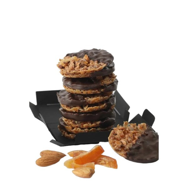 Descubre esta galleta francesa, hecha con almendras tostadas, naranjas confitadas, miel y chocolate semiamargo 55% cacao. Una delicia crujiente y ideales para cualquier ocasión.